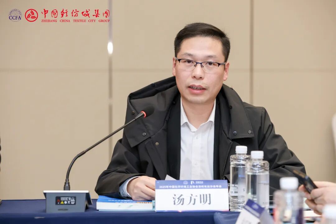 上一届会长单位代表、恒力化纤总经理助理汤方明回顾并分享了分会 2025 年履职成效。分会坚守 “服务会员、服务行业” 的服务宗旨,发布《涤纶长丝行业高质量发展倡议书》,多维度助推行业发展:如常态化组织龙头企业开展行情分析与趋势研判,引导行业自律;精准对接企业需求、延伸服务边界,助力产业生态优化;高效完成《聚酯及涤纶行业 “十五五” 发展规划研究报告》编制,同步配合协会推进三项国家标准相关工作;持续搭建高质量交流平台,为行业合作与创新赋能筑牢支撑等。