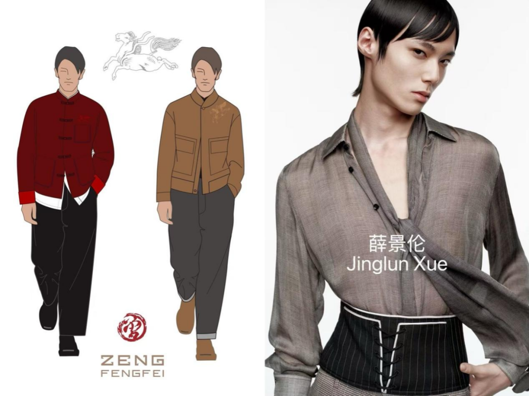 大秀开场,首套丙午系列高定男装,由曾凤飞品牌设计、定制,作品甄选桐昆丝绒面料,将丙午马年元素与非遗割绒工艺相融,尽显新中装时代风骨。同时,特邀近几季活跃在巴黎、米兰国际时装周的超模薛景伦开场演绎。设计师与超模以各自的艺术语言,完成了对纤维面料的时尚表达。