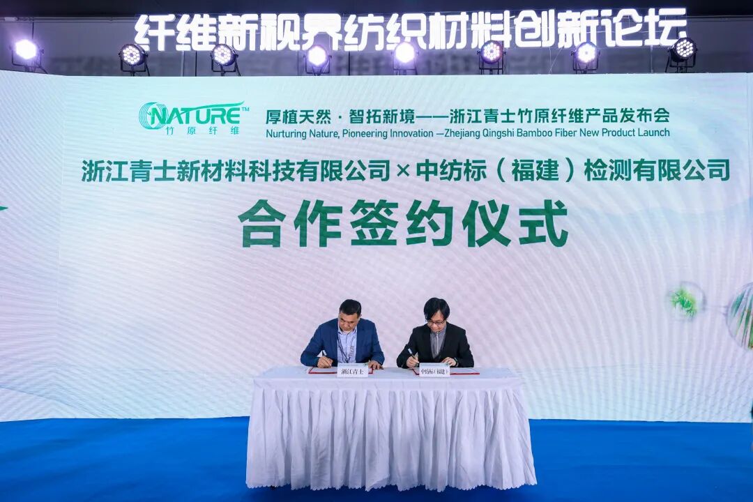 竹原纤维产业的高质量、规范化发展,离不开权威检测技术与行业标准体系的支撑与赋能。发布会现场,浙江青士新材料科技有限公司副总经理陈志良和中纺标(福建)检测有限公司总经理施点望代表双方进行战略合作签约。