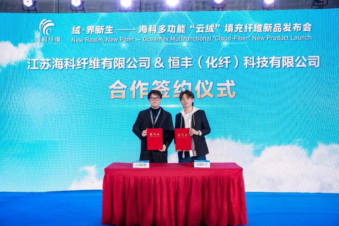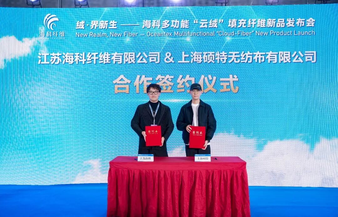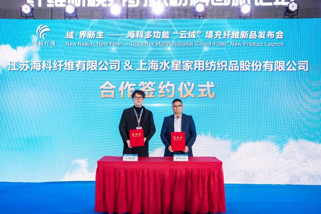 石墨烯云绒主打抗菌、高发热、远红外和驱螨4大功能。根据相关检测,它对金黄色葡萄球菌、大肠杆菌以及白色念珠菌的抗菌率均达到了99%及以上;相比同克重的普通纤维,它在10分钟内升温高出近30℃。气凝胶云绒通过二氧化硅气凝胶与再生聚酯的有机融合,构筑多级孔结构,实现超轻、高保暖性能,保暖率达87.8%,技术达到国内领先水平。姜暖云绒以天然姜酚为核心功能成分,结合微胶囊技术与异形中空结构,赋予纤维远红外蓄热、抗菌防霉、防螨等多重健康功能,技术达国际先进水平。仿生发热绒借鉴北极熊毛“多孔芯+致密壳”结构,结合火山灰功能粉体,实现主动发热与被动保温协同,远红外发射率达0.89,技术达国际先进水平。在发布会“智享真知”环节,来自相关高校的专家深入解读了云绒的技术特点。苏州大学纺织与服装工程学院副教授于金超从材料结构设计、功能复合工艺等角度,解析了云绒系列产品的技术体系与创新路径。他介绍,以仿生发热绒为例,该纤维实现了火山灰功能粉体与再生聚酯纤维有机融合,构筑了不对称中空形态结构,实现了纤维主动发热与被动保温的双效保暖机制。他认为,云绒实现了再生聚酯的功能化重构,打破了再生聚酯的传统应用边界,以绿色科技赋能再生聚酯高端应用的质效进阶。东华大学纺织科技创新中心教授刘一涛介绍,我国研发出性能超越国外高端产品的保暖纤维材料,具有重要意义。他表示,石墨烯云绒是功能化保暖纤维,不仅实现了性能飞跃,还为纺织行业的健康和安全防护树立了新标杆。石墨烯量子点具有可调发光性、高生物相容性特点,还有优异的光电响应性;石墨烯量子点云绒美观、亲肤,具有出色的美观度和功能性,实现了功能和体验的双重升级。会上,江苏海科与上海水星家用纺织品股份有限公司、上海硕特无纺布有限公司、恒丰(化纤)科技有限公司3家合作伙伴签署战略合作协议,标志着云绒系列产品正式进入市场化布局阶段,产业链协同迈出关键一步。