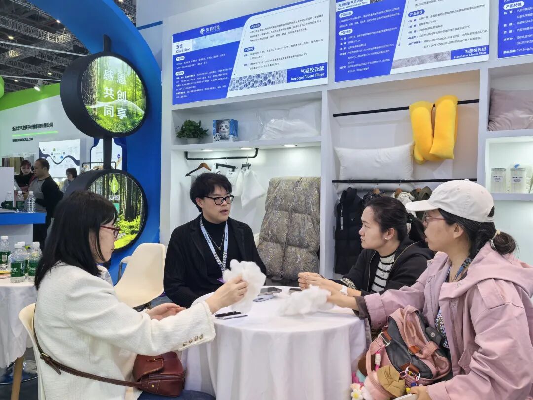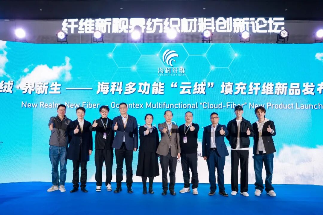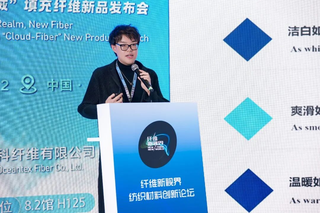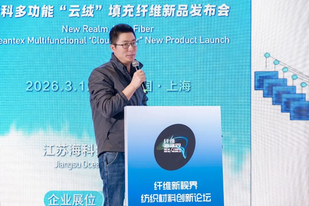 3月12日,绒·界新生——海科多功能“云绒”填充纤维新品发布会在国家会展中心(上海)举办,江苏海科纤维有限公司(以下简称“江苏海科”)重点发布了云绒系列4大创新产品。中国化学纤维工业协会会长陈新伟、副会长兼秘书长关晓瑞,中国化学纤维工业协会循环再利用化学纤维分会秘书长李德利,江苏海科纤维有限公司总经理李辰昊,东华大学纺织科技创新中心教授刘一涛,苏州大学纺织与服装工程学院副教授于金超,上海水星家用纺织品股份有限公司采购总监李飞宇,上海硕特无纺布有限公司总经理沈敏佳,恒丰(化纤)科技有限公司董事总经理洪炳煌等参加发布会。中国化学纤维工业协会副会长兼秘书长关晓瑞在致辞时表示,化纤工业是纺织产业链稳定与创新的核心支撑,循环再利用化纤产业已成为行业高质量发展的重要赛道。江苏海科作为业内“专精特新”企业,长期深耕再生涤纶短纤领域,此次发布的多功能云绒填充纤维,紧扣行业循环发展趋势与市场高端化需求,既是企业自主创新的重要成果,也是产业链协同构建绿色低碳生态的生动实践。她希望江苏海科以此次新品发布为起点,持续深耕再生填充纤维的核心技术研发,不断丰富产品体系,推动云绒系列产品在更多场景落地应用。专注再生填充涤纶短纤领域20年,江苏海科始终坚持创新驱动,形成了拥有自主知识产权的生产技术与完善的产业链布局,致力于推动再生涤纶短纤的高值化、功能化与绿色化发展。目前,其年产能为18万吨。本次发布的云绒系列产品,在技术上实现了多项突破,是差别化、功能性再生涤纶短纤的典型代表。江苏海科总经理李辰昊详细介绍了“云绒”系列四大核心产品:石墨烯云绒、气凝胶云绒、姜暖云绒、仿生发热绒,聚焦轻质锁温、主动健康、抑菌驱螨、远红外保健、仿生发热等方向,标志着再生填充纤维从“低端填充料”向“高端功能性材料”的跃升。