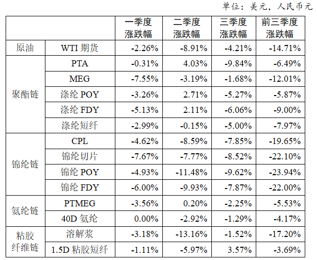 由于原料端支撑减弱,化纤产品市场价格同比下降。聚酯链方面,一季度纤维产品价格跌幅普遍大于其原料跌幅,压缩盈利空间;二季度纤维产品价格虽上涨,但涨幅普遍不及其原料涨幅,再度压缩盈利空间;三季度纤维产品价格虽处于下滑趋势,但其原料降幅更为明显,加工差有所扩大(图3)。锦纶链方面,前三季度各环节价格下滑态势明显,跌幅均在20%左右(图4、表1)。
