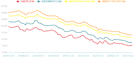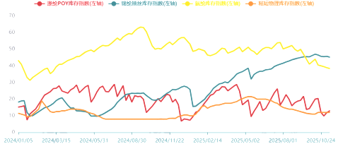 库存方面,涤纶长丝受益于5月中旬企业集中安排停产检修,5、6月库存去化进程加快,7月库存有所回升并在中旬达到26天(以POY为例),此后呈现震荡下降趋势,10月末降至9天(图2)。锦纶库存大幅增加,虽然二、三季度减产幅度扩大,但仅是减缓了库存上升的速度,10月末升至46天。氨纶库存则延续2024年下半年以来的高位震荡态势,上半年基本维持在50天左右;7月下旬库存出现下降趋势,10月末降至40天。