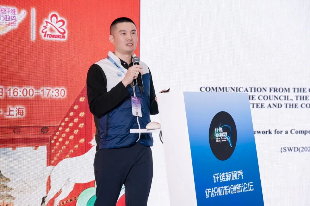 浙江青土新材料科技有限公司总工程师王乐军带来《高值高品质纺织用竹原纤维制备及其综合应用》的分享。他指出浙江青士依托我国丰富的竹资源优势,致力于竹原纤维制备技术及装备研发,通过AI识别分离、新型生物酶开纤等关键技术,依托资源优势重构产业链,构建竹原纤维生态圈的运行模式,实现以竹代木、以竹代塑。竹原纤维具备天然抑菌、吸湿快干、防紫外线等优异性能,广泛应用于运动户外、家纺床品、婴童服饰等领域。王乐军表示,未来,竹原纤维的创新发展与持续升级,将为推动生态效益与经济效益有机统一提供新路径。